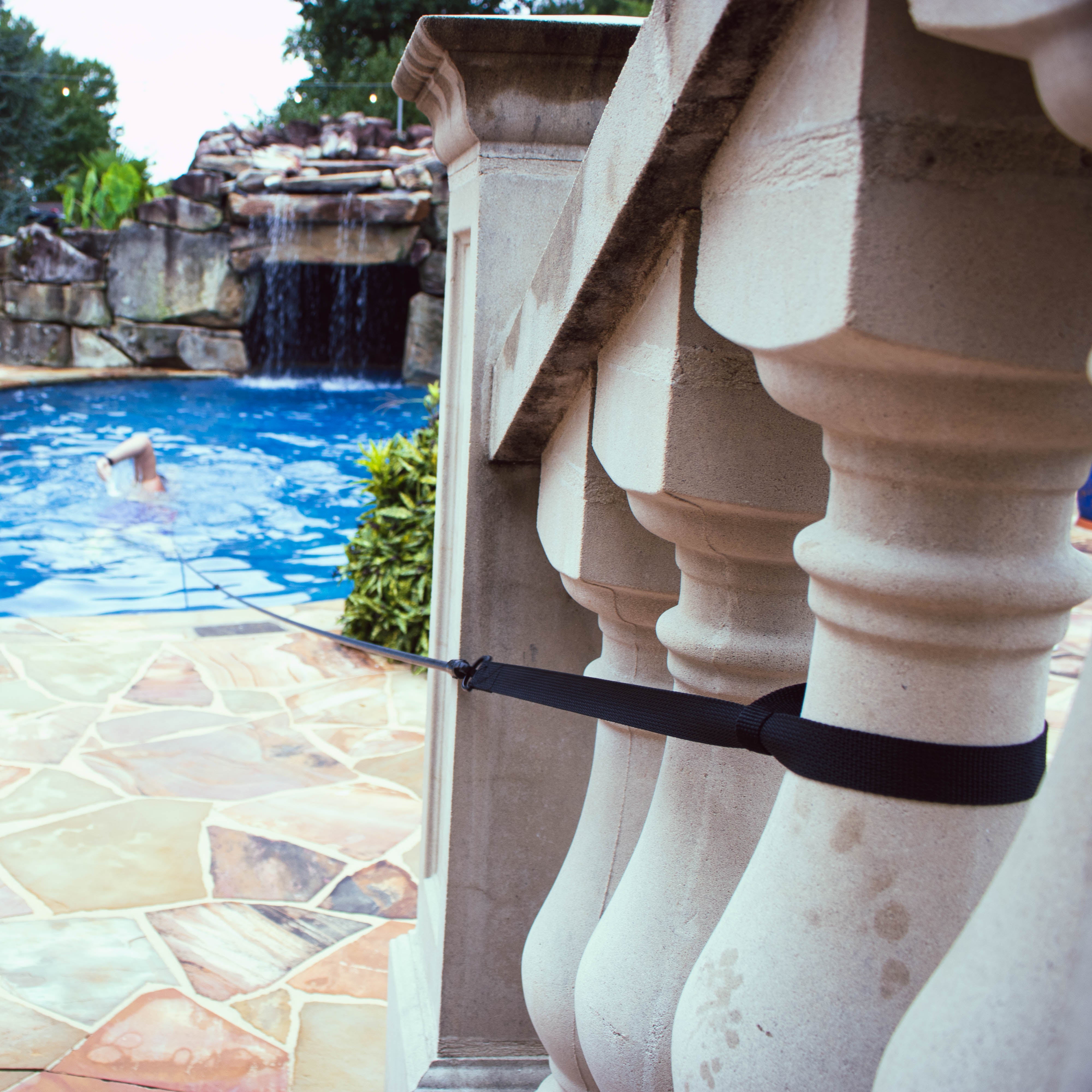 No pole. No installation. Loop the anchor strap around any handrail or fence and swim in any pool. Perfect for hotels, vacation rentals, and on-the-go training.