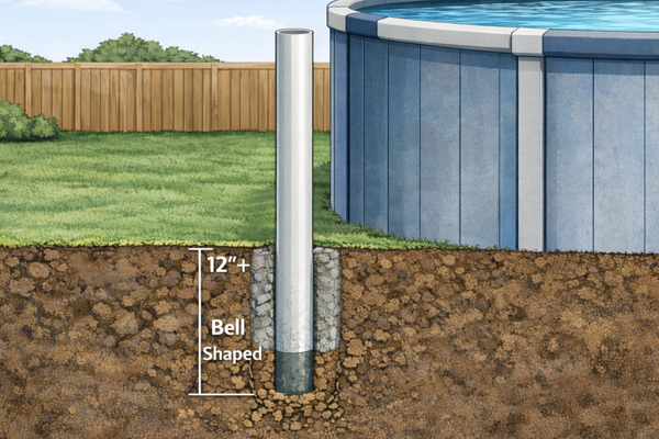 Depth matters. Minimum PVC embedment is 12" below grade, but colder regions may require deeper footing placement to reduce frost heave. Best practice is setting the bottom of the concrete footing below your local frost line. If you don't know your frost depth, check local building guidance for your area.